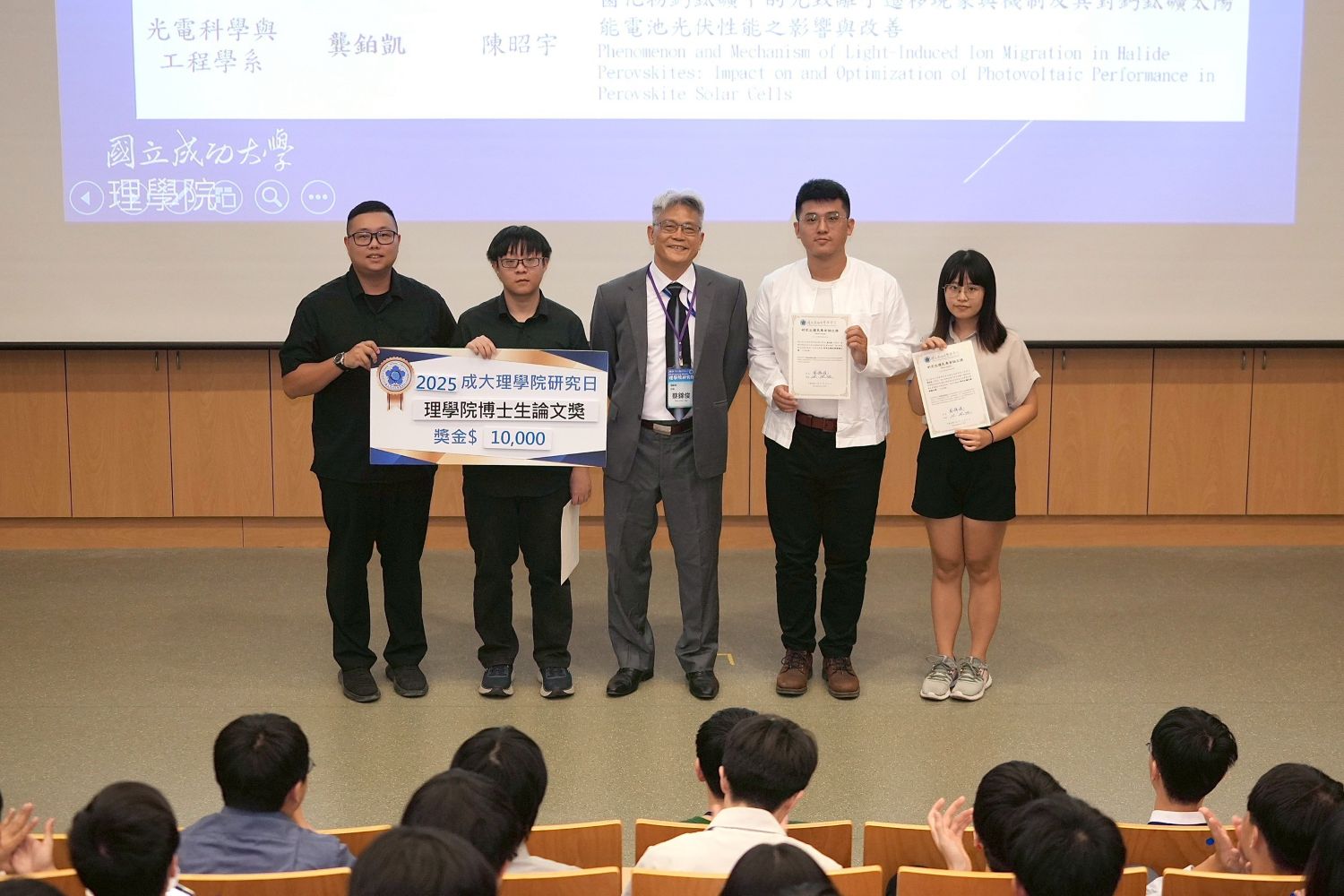 本屆活動由成大研究發展處補助經費,並獲張桐生學術文教基金及田明朋學術研究基金會贊助獎金,除原有學術獎項外,今年特別新增「最佳人氣獎」,由參展學生與高中生票選,增添現場互動及交流。當日下午舉行頒獎典禮,首先頒發理學院研究生優良畢業論文獎,包括博士生 4 名、碩士生 14 名;研究成果發表會則由 19 位教授擔任評審,每篇海報均由 3 位評審評分,最終頒出 56 個學術獎項及 5 個最佳人氣獎。其中,理學院院長獎由光電科學與工程學系黃卓敏同學獲得,指導教授為徐旭政教授。