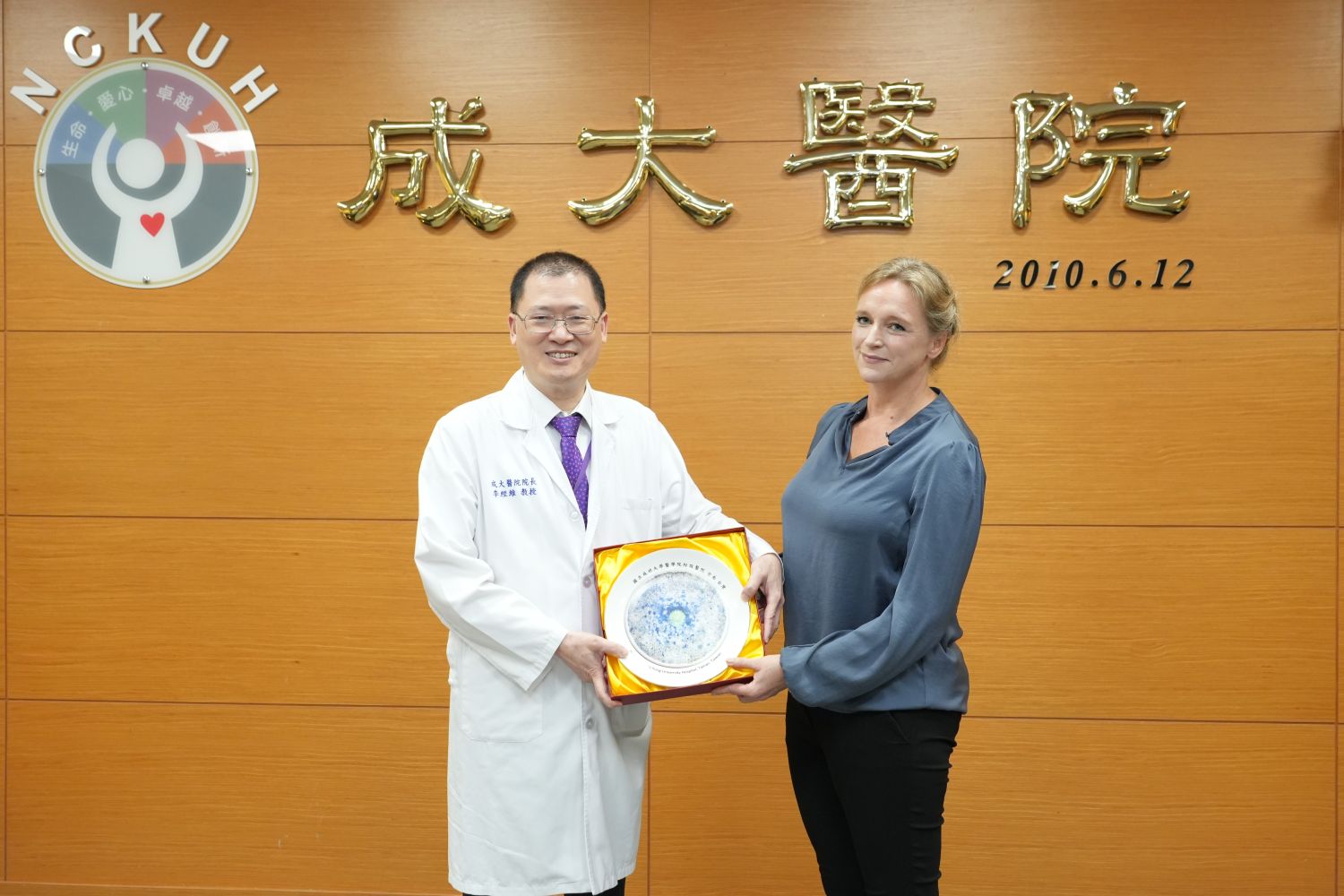 成大醫院李經維院長(左)贈禮給瑞典駐臺代表任荷雅