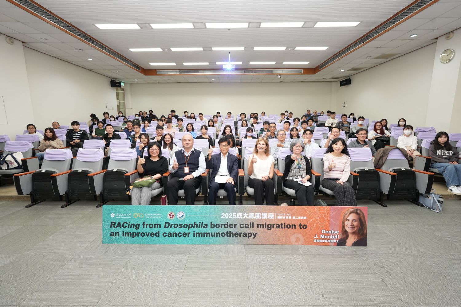 國立成功大學生物科學與科技學院於 12 月 5 日邀請美國國家科學院院士、國際細胞生物學領域權威-美國加州大學聖塔芭芭拉分校 Denise Montell 特聘教授擔任成功大學「2025成大鳳凰講座」講者。Denise Montell 教授以「RACing from Drosophila border cell migration to an improved cancer immunotherapy」為題,從果蠅邊界細胞遷移研究出發,探討其與癌症免疫療法的跨領域連結。成大研發長劉全璞、生科學院院長王育民、生科產業系系主任郭瑋君等多位師長出席聆講,活動更吸引校內外對細胞生物學、發育生物學及癌症研究領域具有高度興趣之師生與民眾踴躍參與,討論與提問交流熱烈。