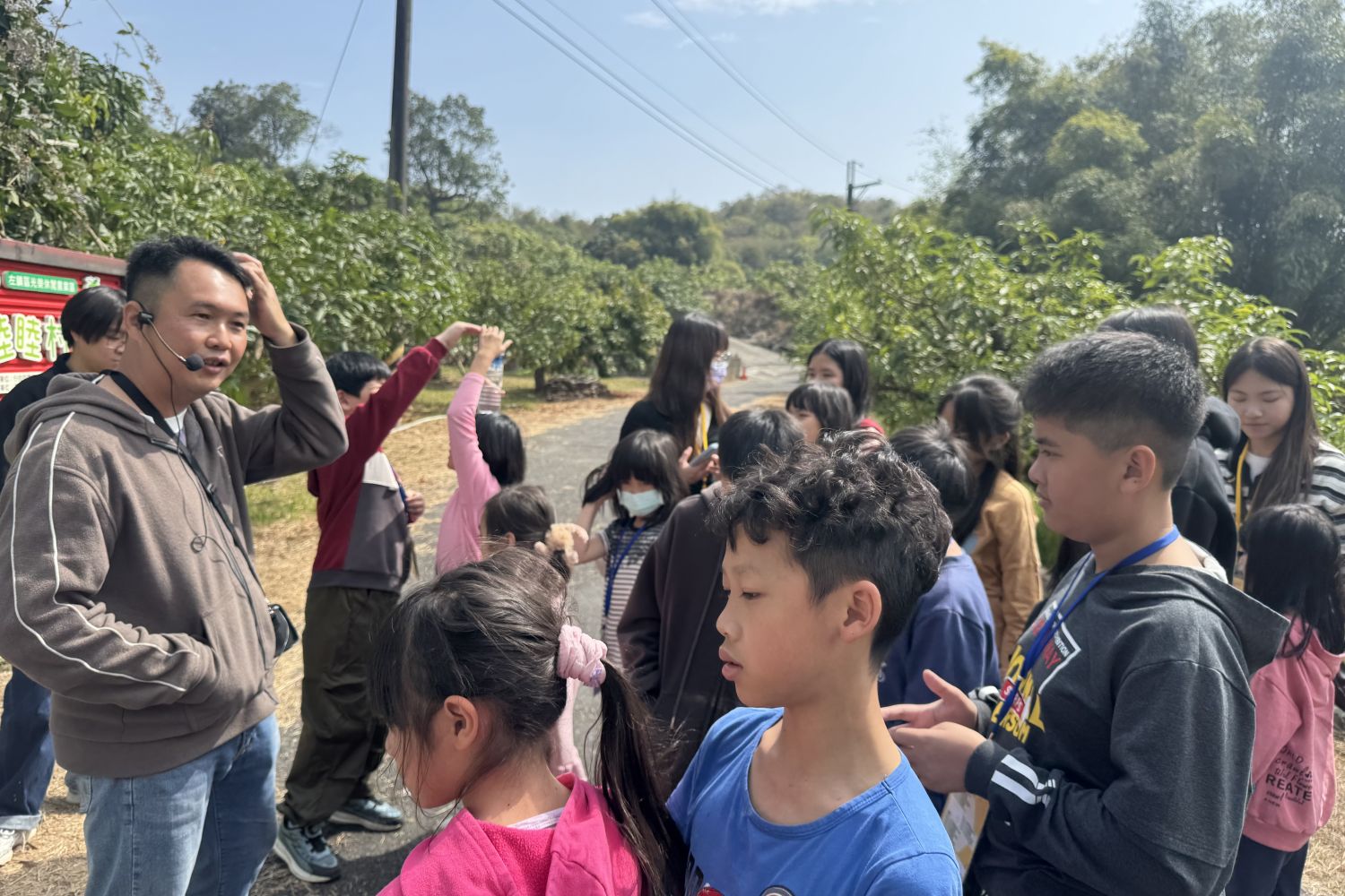 睦睦村果園陳冠丞園長(左)為學童介紹芭樂的種植