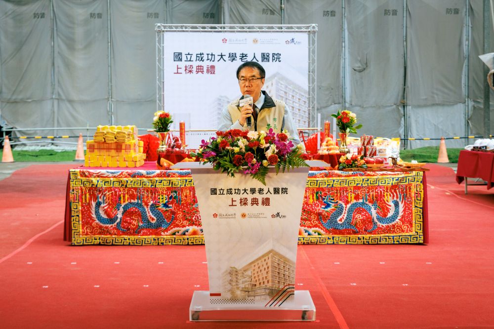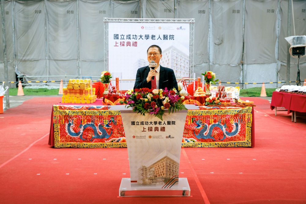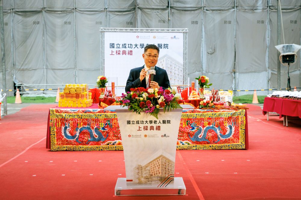 成大校長沈孟儒致詞回顧興建老人醫院從概念提案、爭取經費、醫院設立到開始執行的各個重要階段,並逐一感謝一路支持與幫忙的重要人士。他表示,老人醫院能夠真正落實在臺南,要感謝很多人的幫忙,興建過程歷經地緣政治變化、疫情考驗、通貨膨脹等因素,著實不易。今日的上樑典禮是重要里程碑,特別拜託工程團隊持續努力,希望未來加速落成進程邁向正式營運。